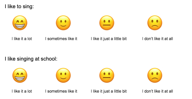 If you agree to join this study, you will be asked to complete this online survey. The survey is anonymous which means that we will not know your name, only how old you are, and in what town you live, and what school you attend.. You will be asked to tell us what you think and feel about singing, if you sing at home or at school, and what you think about singing as a result of the pandemic. The survey will take you about 20 minutes to complete. Here are some examples of what the questions will be and what they will look like: